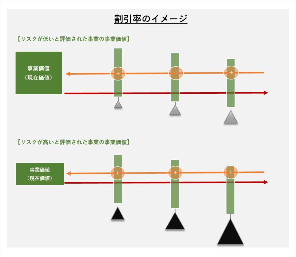 ◆「割引率は錘(おもり)」「倍率は風船」とイメージすると理解しやすいかもしれない。M&A取引では、DCF法とEBITDA倍率法を併用し、総合比較しつつ価格交渉するケースが多い。EBITDA倍率法では「倍率」を利用する。「倍率」は今のキャッシュフローに「掛け算」して事業価値を算定する。一方、「WACC等のDCF法の割引率」は、将来キャッシュフロー(n期, n+1期・・・)をそれぞれ「割り算」して事業価値を算定する。つまり、細かい話を省略すれば「倍率」と「割引率」は算数で言うところの「逆数」のような関係にある。リスクが低ければ「錘(割引率)」は小さくなり、「風船(倍率)」は大きくなる。下のイメージ図のように「水面に顔を出している部分だけが現在価値に加算されていく」「現在から近いなら小さな錘、遠いなら大きな錘」ということである。