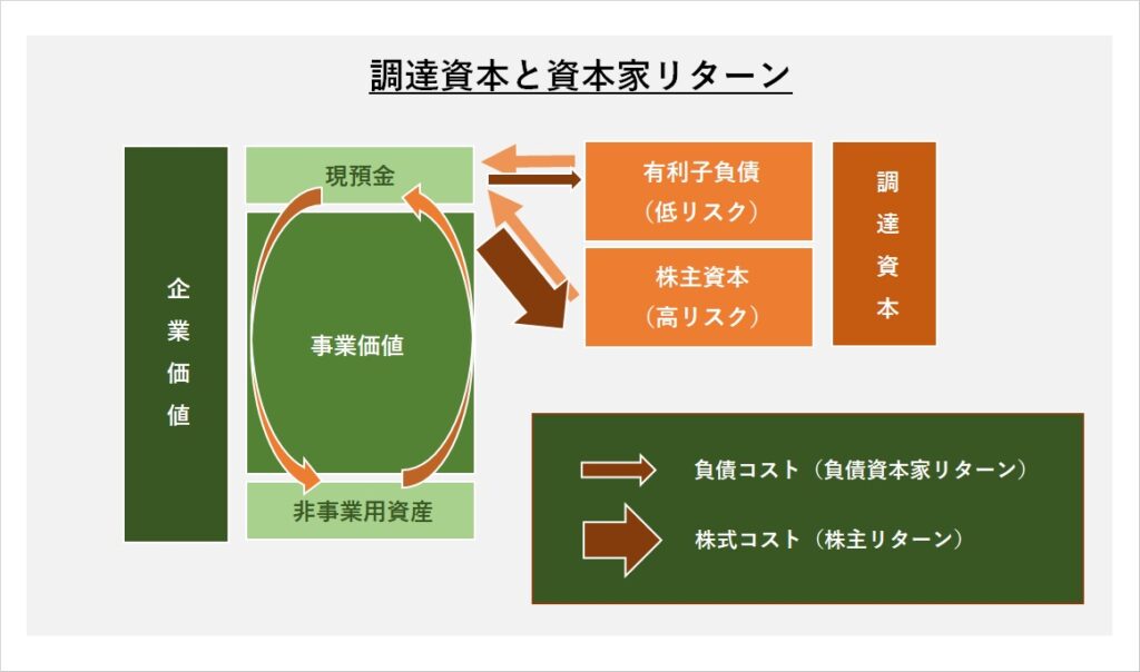 ◆加重平均資本コスト(WACC)とは、DCF法(WACC法)で将来期間の計画値のフリー・キャッシュフローを現在価値に割引く際に使用される割引率である。「調達資本(株主資本と有利子負債)の平均的な要求利回り」という意味も持つ。低リスクな有利子負債では「貸付利率や社債利回り等」が資本コストとなり、高リスクな株式では株主資本コストが資本コストとなる。前者は小さく後者は大きく、これらを時価残高で加重平均したものがWACCである。なお、WACC法にはいくつか問題(負債比率の変動や時価の算定に時価が必要など)があるため、有利子負債が存在しない仮定の上で、株主資本コストのみで算定するAPV法を採用するケースも多い。